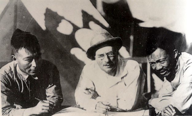 袁复礼(左)和瑞方团长斯文赫定(中)、中方团长徐炳昶(右)在一起研究工作(1927年)