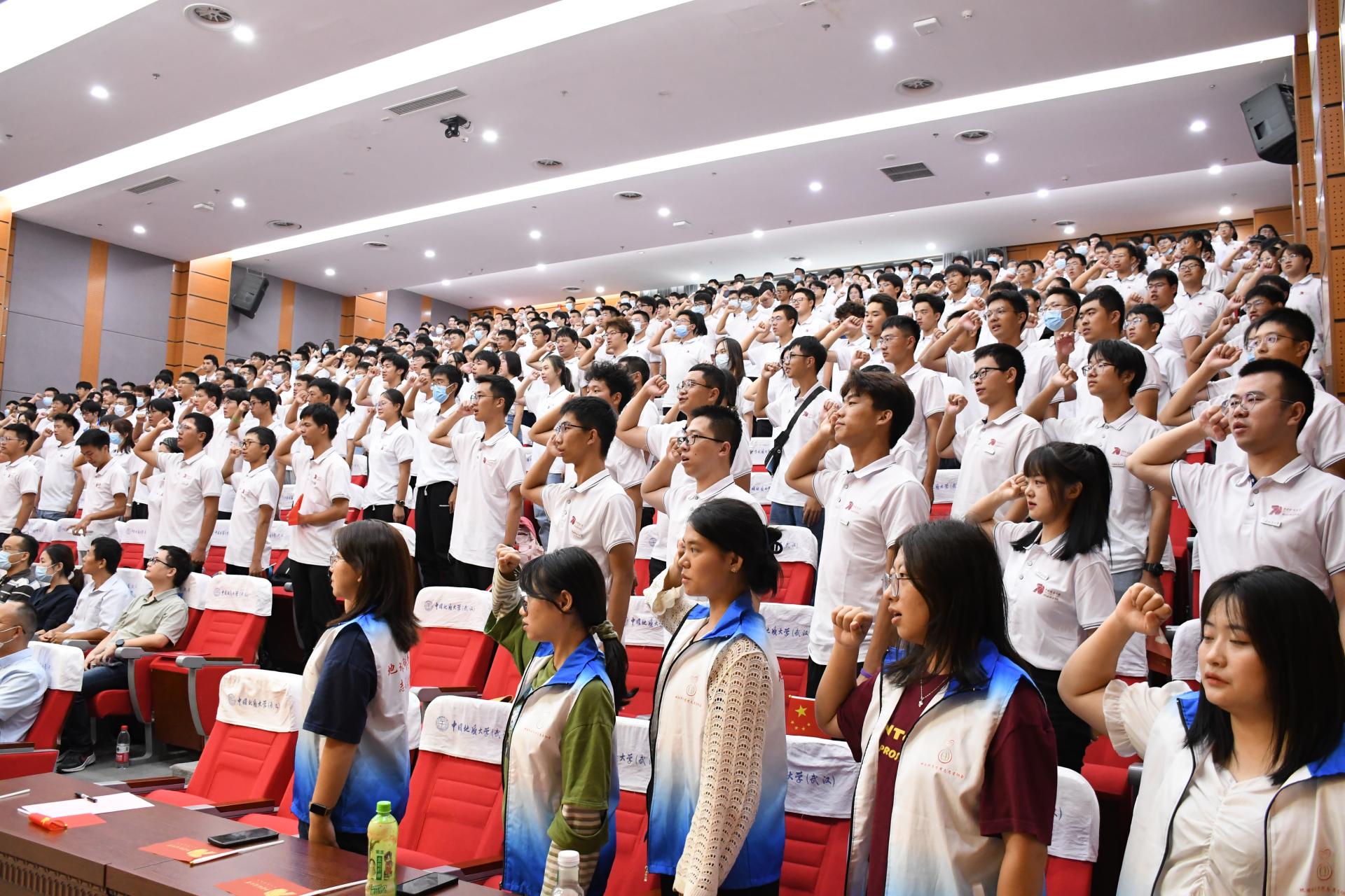 “志存高远,尊师重道,刻苦学习,钻研地球科学。”铮铮誓言,铿锵有力!在老师们的见证下,2022级全体新生庄严宣誓,这意味着每一位新生从今以后有了一个共同的名字:地质人。