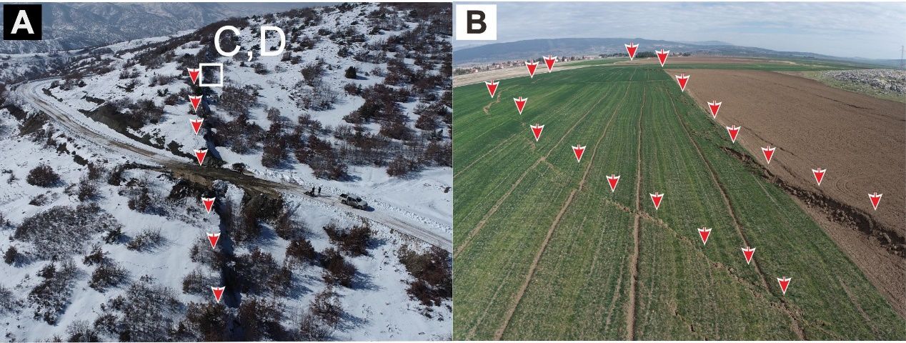 2023年2月16日,土耳其首震发生后第十天,Kusky研究团队将项目组成员博士生孟建南派达震区,与项目组海外合作者成员土耳其中东技术大学地质工程学院院长、在线av (武汉)客座教授Erdin Bozkurt教授共同开展震后地质调查。项目组在地表破裂痕迹被降雨、洪水、灾后重建以及其他震后变形作用破坏之前,对与该次地震事件造成死海断层、东安纳托利亚断层的地表位移进行系统实地测量,并选取代表性区域,对地震导致的地表破裂进行厘米级无人机填图,并以数字地图的形式永久保存。这是人类历史上震后罕见和及时的地表破裂变形原始记录,为大型走滑型地震事件导致的地表变形、破裂在复杂断层系统之间的传播机制提供了重要参考。文章成果于2024年1月19日发表在《Science》期刊,并作为Research Highlight推荐。第一作者为在线av (武汉)在线av 2018级博士生孟建南和Timothy Kusky教授,共同通讯作者为Timothy Kusky教授和美国地质调查局Walter Mooney教授,共同作者还包括土耳其中东技术大学地质工程学院Erdin Bozkurt教授,土耳其哈卡里(Hakkari)大学工程学院Mehmet Nuri Bodur教授和地质过程与矿产资源国家重点实验室王璐教授。