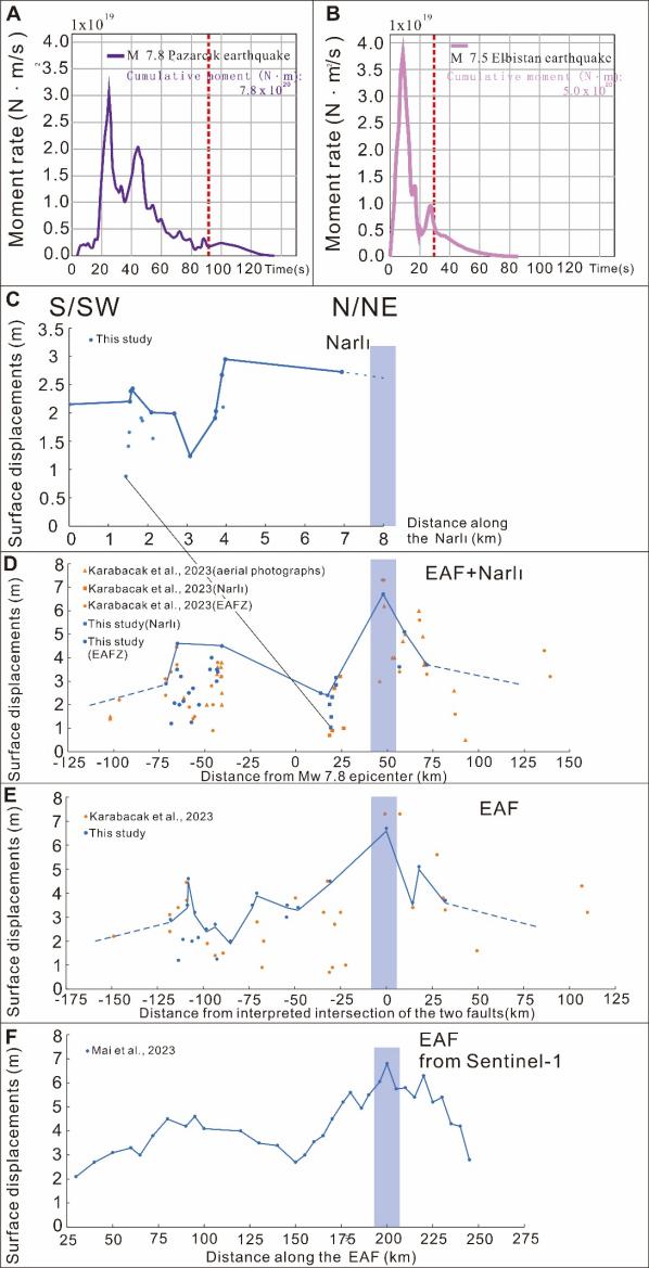 此前,研究团队对2020年10月发生在土耳其安纳托利亚板块西部罕见的Mw 7.0伸展型地震也开展了相关研究,通过野外工作获得重要新构造活动断层的运动学数据,结合地球物理研究提出,Mw 7.0地震事件是在大洋向大陆板块俯冲汇聚板块边界,俯冲的板块发生回撤背景下造成的上盘伸展型地震,整个区域地表构造以南北向伸展为特征(Meng et al., 2021)。而本次发生在安纳托利亚板块东部地震事件,处于大陆向大陆碰撞的汇聚板块边界,是挤压和走滑共同作用的背景下发生的地震。是在北向运动的阿拉伯板块与欧亚板块碰撞、安纳托利亚板块侧向挤出这一构造背景下,死海断层带(DSF)和东安纳托利亚断层带(EAF)两条重要的转换型板块边界及其分支在板块构造运动的背景下共同活动导致的(图1)。本研究开展的实地勘察结果、美国地质调查局的地震数据和卫星图像数据共同揭示,M7.8级地震震中位于死海断层北部尽头的Narlı段,震后地表形成2-2.5m的位移。震后24秒钟,破裂向北部传播到应力积聚已达上百年的东安纳托利亚断层,激活了整条东安纳托利亚断层带,导致地表产生长达350km的破裂带,并引发大量余震。值得注意的是,两条断层的交汇处测得的地表位移为6.7m,是整个地震区域实测地表位移的最大值。随后,破裂自交汇处向东安纳托利亚断层两侧不断传播,位移错动值也向两侧逐渐递减(图2),约9小时后,一个位于东安纳托利亚断层带与Çardak-Sürgü (Ç-SF)断层带交汇处的余震事件,诱发了第二次Mw7.5地震事件,同时激活了整条Çardak-Sürgü fault断层带,形成了约110km的地表破裂,并在该断层带上再次诱发大量余震。