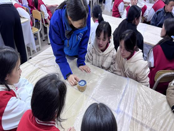 本班科普课堂后是DIY串珠手链体验活动,李槟馨在讲台上演示,罗明辉和支教团赵安然老师辅助在各个小组间逐一指导,学生们挑选了喜欢的颜色及矿物珠子原料,按照各自的手腕粗细,完成了自己独一无二的珠宝手链,在学思践悟中感悟珠宝矿物的魅力。