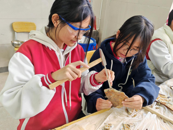 在科普讲座后的化石修复环节,同学们全副武装,佩戴好护目镜、戴好手套,自己动手,让千万年前的化石终得以再见天日,看着自己从岩石里“敲”出来的鱼化石都非常欣喜。在探索过程中,孩子们亲手体验观察、清灰、开凿等一系列化石发掘的流程,化身小小“考古家”,在实践中与数亿年前的生命对话,感悟生命演变的秘密。