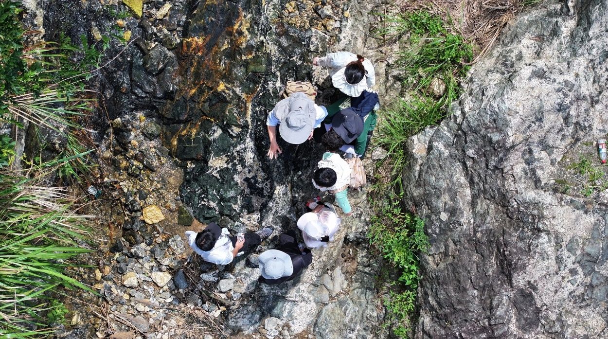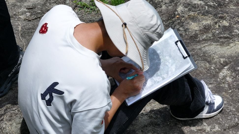 在前一天安排下,安全员提醒大家轮流在太阳下工作,每半小时及时到阴凉处休息补水和及时就餐,防止中暑。同学们工作非常认真,露头上的暴晒不到一分钟就开始汗流浃背,但丝毫没有影响到大家的工作热情,大部分小组当天就对工作区的填图工作完成了近80%。尤其是大一的同学,尽管专业知识没有大二、大三接受得多,但他们在露头上坚守的时间最长,老师和安全员数次提醒他们到阴凉处休息都迟迟不肯离开露头。同学们的午餐在露头上快速解决后,又及时返回露头开始工作。