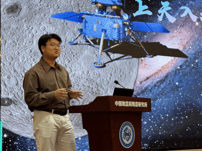 随后,学院“地学之光”科普讲解队成员姜昕接续开讲,以《上天入地,地球化学》为题展现学科交叉魅力。他从嫦娥六号月壤研究切入,结合国际顶级期刊发表的科研成果,讲解月壤中氦-3资源价值、42亿年高铝玄武岩与28亿年低钛玄武岩所记录的月球火山活动史,同时介绍大陆地壳平均成分研究等地球化学核心内容,让在场听众直观感受“从月球到地球”的地学探索脉络,有效促进院所学科交流。