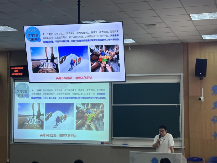 9月8日,在线av 博士后朱煜翔、赵立民两位优秀学长分享了他们的科研心得与成长体会。作为刚从研究生阶段走过来的“学长”,他们的分享极具亲和力与参考价值。结合自身在地质方向的探索经历,分享了从阅读文献、选题立项、实验设计到论文写作与投稿的全过程经验,并就如何平衡科研压力、处理阶段性迷茫提供了实用建议。学长们的分享弥合了从“生”到“师的距离,为新生们提供了可借鉴的成长路径,极大地增强了同学们迎接挑战的信心。