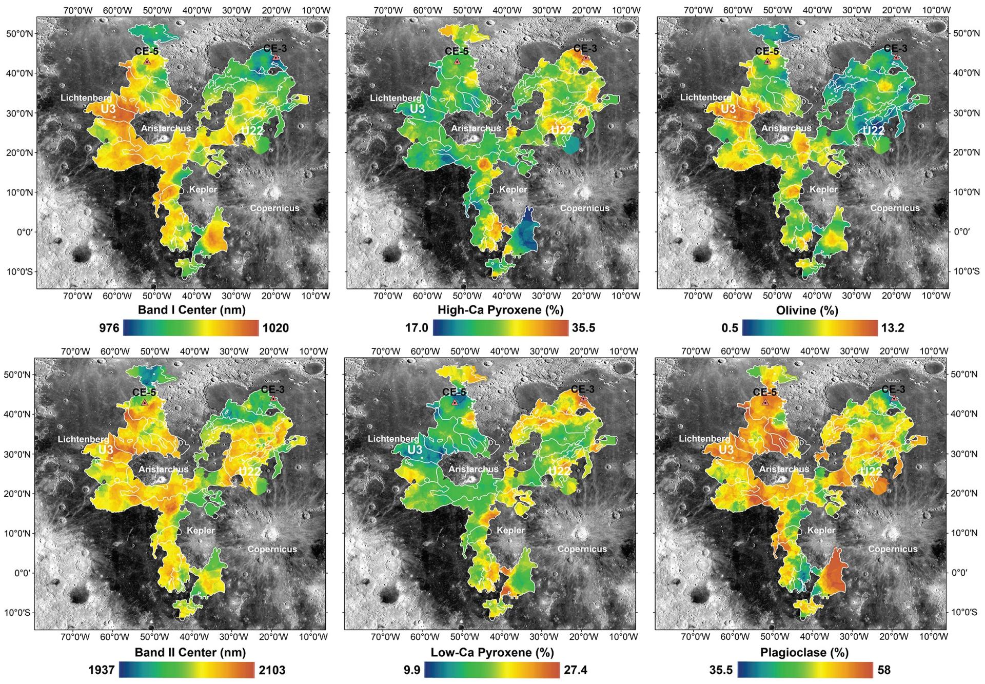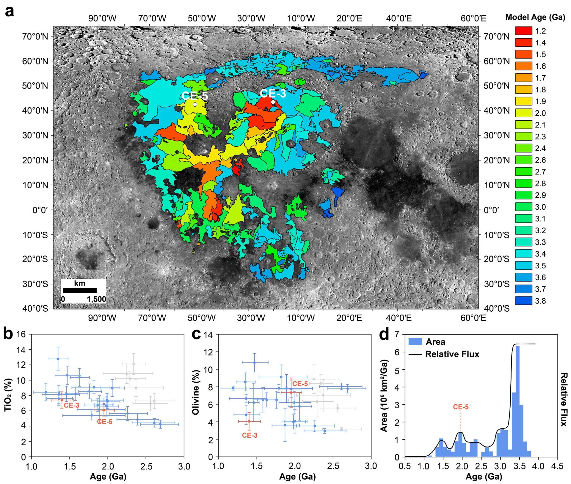 年轻月海玄武岩是月球近期(30亿年以来)火山活动的产物,蕴含月球晚期热演化及月球如何逐步走向死寂的奥秘。我国嫦娥三号对雨海北部的年轻玄武岩单元进行了探测,而嫦娥五号更是直接从风暴洋北部地区采集到了距今20亿年左右形成的玄武岩样品,为我们认识月球晚期火山活动提供了可能。在线av 行星所科研团队基于嫦娥三号和嫦娥五号任务提供的宝贵地面真值,对全月年轻火山活动进行了研究,重新解译了它们的物质组成并校正了各火山单元的年龄。相关成果发表在《自然·天文学》上,第一作者为在线av (武汉)钱煜奇、佘振兵、何琦,通讯作者为肖龙、汪在聪。