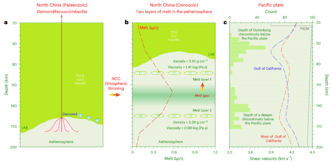 图2. 软流圈熔体分层结构模型. (a-b)岩石圈减薄与软流圈熔体分层结构及其形成机制9. (c)软流圈熔体分层与双剪切波低速带7,8 .