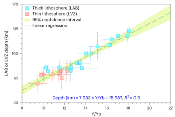 图1. 全球大陆/大洋年轻火山岩地区玄武岩Y/Yb比值与岩石圈-软流圈边界(lithosphere-asthenosphere boundary, LAB)或地震低速带(low-velocity zone, LVZ)深度之间的相关性6.
