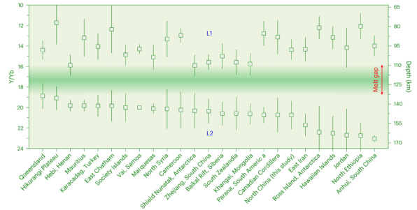 图3. 不同构造板块25个地区的大洋/大陆玄武岩具有类似的双峰式Y/Yb比值. 软流圈熔体分层结构 (80–110 km vs. 140–165 km) 在全球范围内广泛分布.