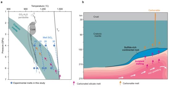起源于克拉通之下,深部地幔的初始岩浆富含碳酸盐组分,向上迁移时会横向流动至边缘区域,从而导致岩石圈厚度相对较小的边缘地区火山活动频繁。该论文通过高温高压实验模拟了这种边缘岩浆的演化过程,发现当富含碳酸盐岩浆从克拉通下方向上迁移时,其中的硅酸盐组分发生沉淀,导致岩浆中硅逐渐被去除,最终转变为几乎纯的碳酸盐岩浆,即火成碳酸岩。当岩浆中的硅酸盐发生沉淀时,其中蕴含的金属和硫元素也以硫化物的形式从岩浆中沉淀出来,最终在克拉通边缘形成线性分布的金属和硫的异常富集带,即具有硫化物富集特征的大陆根。研究人员通过对克拉通边缘区域火山喷发携带的地幔样品进行统计分析,发现在克拉通底部约160-190km处的地幔中硫和铜均显著富集,进一步支持了克拉通边缘区域具有富硫化物的大陆根这一发现。