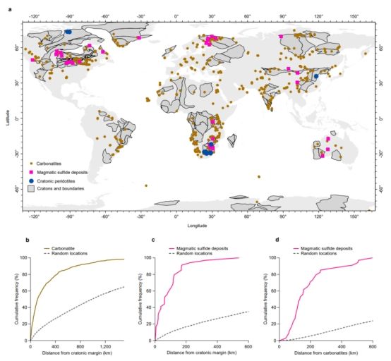 该论文通过对碳酸岩、硫化物矿床和克拉通的时空相关性分析,发现克拉通边缘区域同时富集火成碳酸岩和岩浆硫化物矿床,硫化物矿床与碳酸岩通常具有时空一致性,表明由碳酸盐熔体迁移形成的富硫化物大陆根控制了岩浆硫化物矿床的分布。该研究揭示了硫化物矿床与碳酸岩之间的成因关系,发现了克拉通边缘的富碳酸岩区域是关键金属的富集地,这一发现为未来矿产资源的勘探和开发提供了科学依据和重要方向。