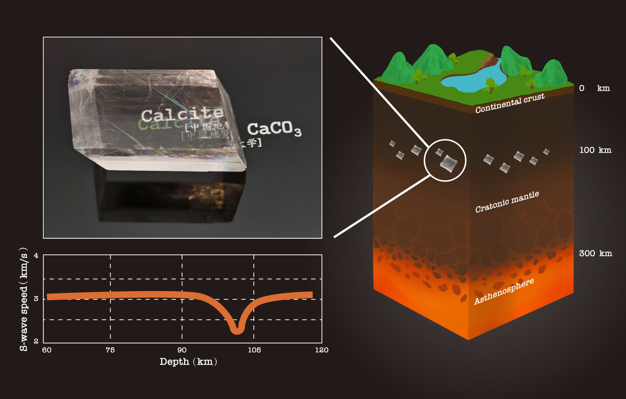 图1. 方解石(CaCO₃)晶体(左上)、其在克拉通岩石圈地幔中的剪切波速度变化特征(左下),以及方解石在克拉通岩石圈地幔中的潜在分布示意图(右)