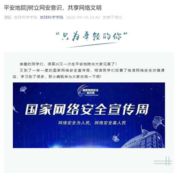 七、增强网络安全意识。广泛开展网络安全意识宣传,10月23日,安全保卫部副部长彭冠军老师以“平安校园你我同行”为主题为在线av 学生干部作防范电信网络诈骗安全培训,分析了当前校园反诈的严峻态势,介绍了校园常见的网络诈骗类型,叮嘱同学们增强法律和防范意识,谨防电信网络诈骗。国家网络安全学习周时期,发布《平安地院|树立网安意识,共享网络文明》推文,系统总结国家网络安全课内容,利用学生喜爱的平台及方式方法持续开展网络安全意识宣传。