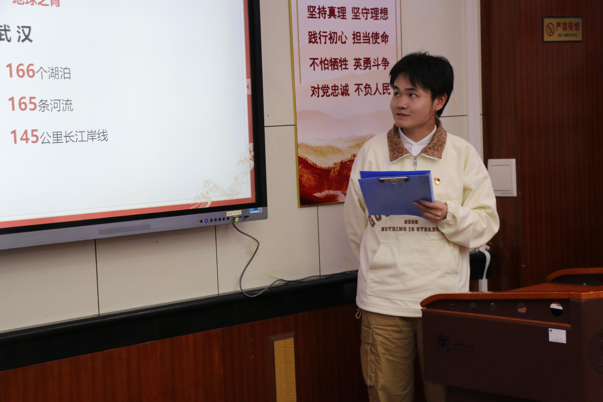 本科生基地班党支部的孙永芳以《守护绿水青山,建设美丽中国》为题,全面总结十年来我国在生态文明建设方面取得的重大成就,联系我校积极响应党中央号召、始终致力于推动“美丽中国,宜居地球”建设的战略蓝图,结合自身到武汉市青山区江滩、戴家湖公园及武钢集团调研的经历,鼓励地学青年发挥地球系统科学思维优势,深入学习贯彻习近平生态文明思想,为推动美丽中国、宜居地球建设贡献自己的一份力量。