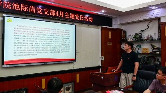 在活动的最后马昌前教授和秦傲老师为当月入党的党员们颁发纪念卡,庆祝他们的“政治生日”。 主题党日上,全体党员还开展了中央八项规定精神问题查摆和知识自测,并足额缴纳了4月党费。